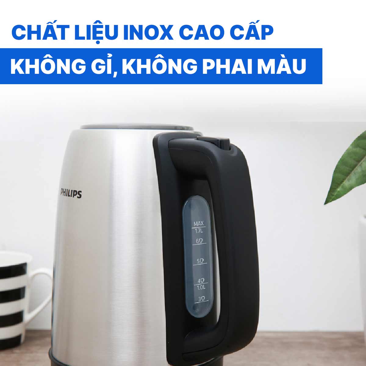 Philips HD9350 được hoàn thiện từ chất liệu inox cao cấp sáng bóng, không han gỉ, bền bỉ và an toàn với sức khỏe người dùng. Khả năng gia nhiệt nhanh giúp nước sôi chỉ trong vài phút, tiết kiệm thời gian tối đa cho những ai luôn bận rộn. Ngoài ra, bề mặt inox cũng giúp việc vệ sinh trở nên đơn giản hơn.