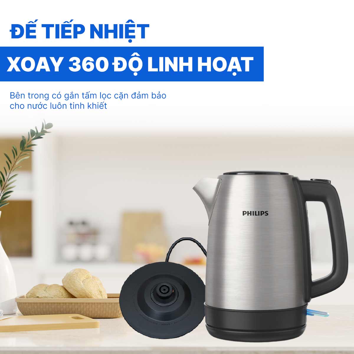 Với thiết kế đế xoay tròn 360°, Philips HD9350 mang đến sự linh hoạt tối đa trong quá trình sử dụng. Có thể dễ dàng nhấc lên và đặt xuống từ mọi góc độ, phù hợp cho cả người thuận tay trái lẫn tay phải. Việc rót nước trở nên nhẹ nhàng, nhanh chóng và an toàn hơn, đặc biệt khi bạn đang bận rộn hoặc cần thao tác nhanh trong bếp.