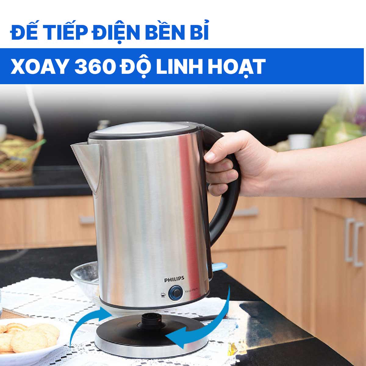 Với thiết kế đế xoay tròn 360°, ấm siêu tốc Philips mang đến sự linh hoạt tối đa trong quá trình sử dụng.