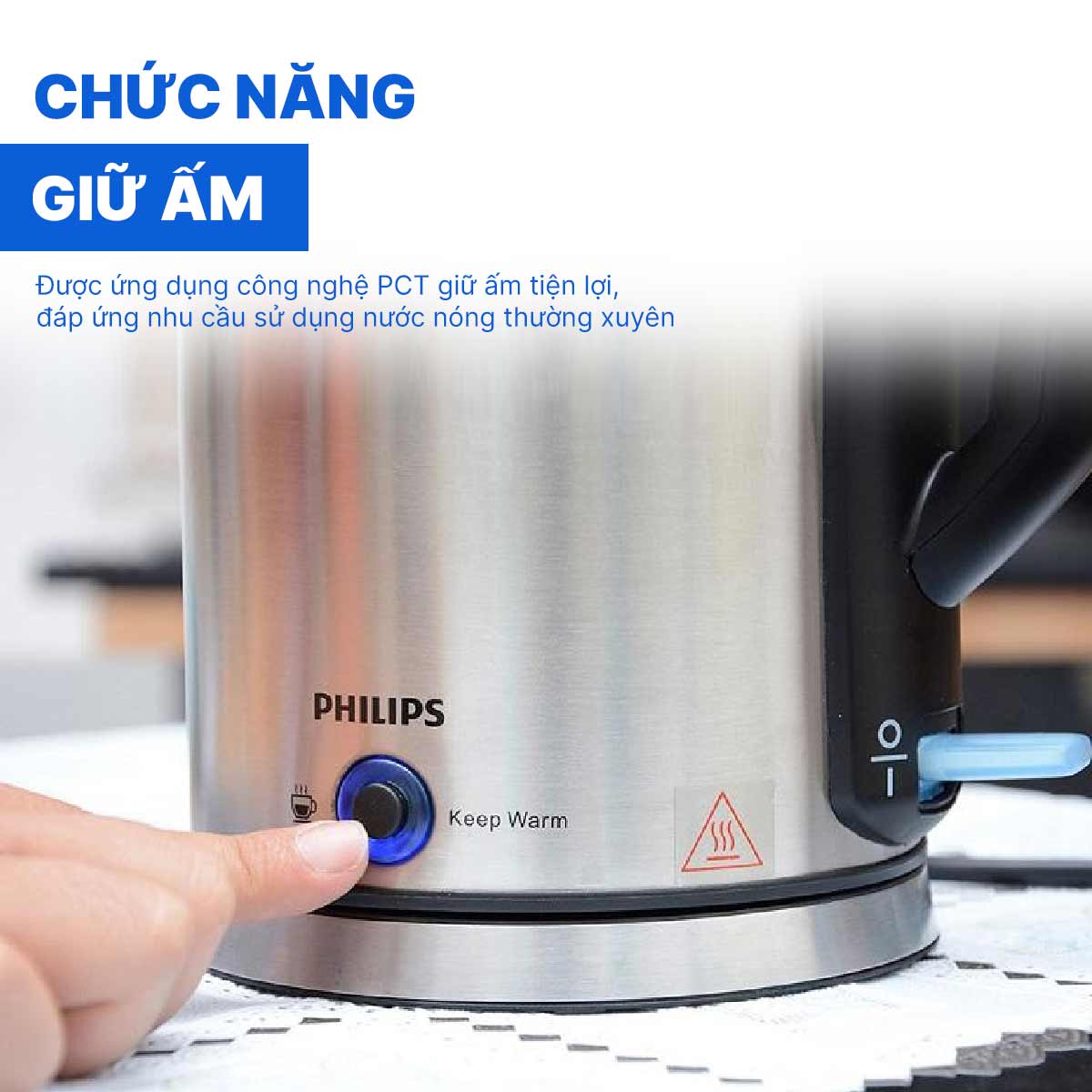 Ấm siêu tốc Philips HD9316 dung tích 1.7 lít được trang bị công nghệ giữ ấm PCT hiện đại, lý tưởng cho những ai thường xuyên cần nước nóng. Chỉ cần bật công tắc giữ nhiệt, nước trong bình sẽ luôn duy trì ở mức khoảng 85°C (+/- 5°C), đảm bảo luôn có nước ấm sẵn sàng để pha sữa, pha trà hay sử dụng ngay mà không phải mất thời gian đun lại. Giải pháp tiện lợi giúp tiết kiệm thời gian và mang lại sự chủ động cho mọi nhu cầu hằng ngày.