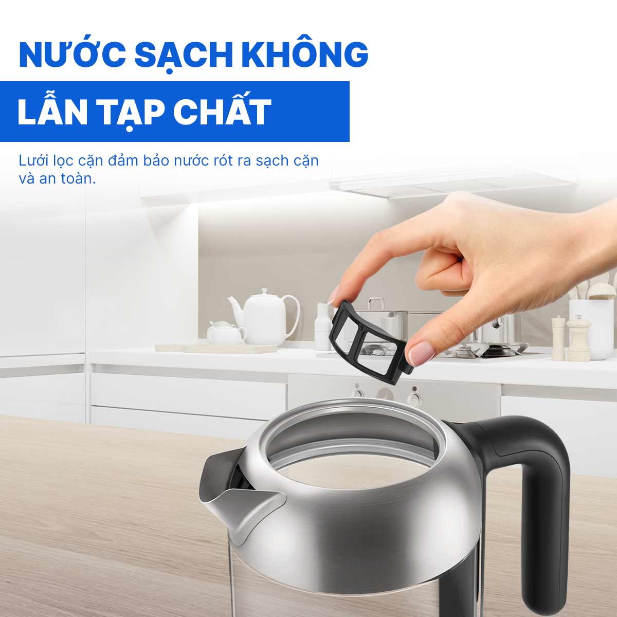 Nếu bạn đang tìm kiếm một chiếc ấm đun nước không chỉ tiện dụng mà còn góp phần nâng tầm không gian bếp, thì Philips HD9339 chính là lựa chọn lý tưởng. Với thiết kế sang trọng, vỏ ngoài bằng thuỷ tinh trong suốt, sản phẩm không chỉ mang lại vẻ tinh tế mà còn giúp người dùng dễ dàng quan sát mực nước bên trong. Công suất mạnh mẽ 2200W giúp đun nước cực nhanh, tiết kiệm thời gian tối đa cho những buổi sáng bận rộn. Bên cạnh đó, ấm còn được trang bị miệng rộng thuận tiện cho việc vệ sinh, cùng các tính năng an toàn như giữ ấm, tự động ngắt khi nước sôi hoặc khi cạn nước, mang lại sự an tâm trong quá trình sử dụng.