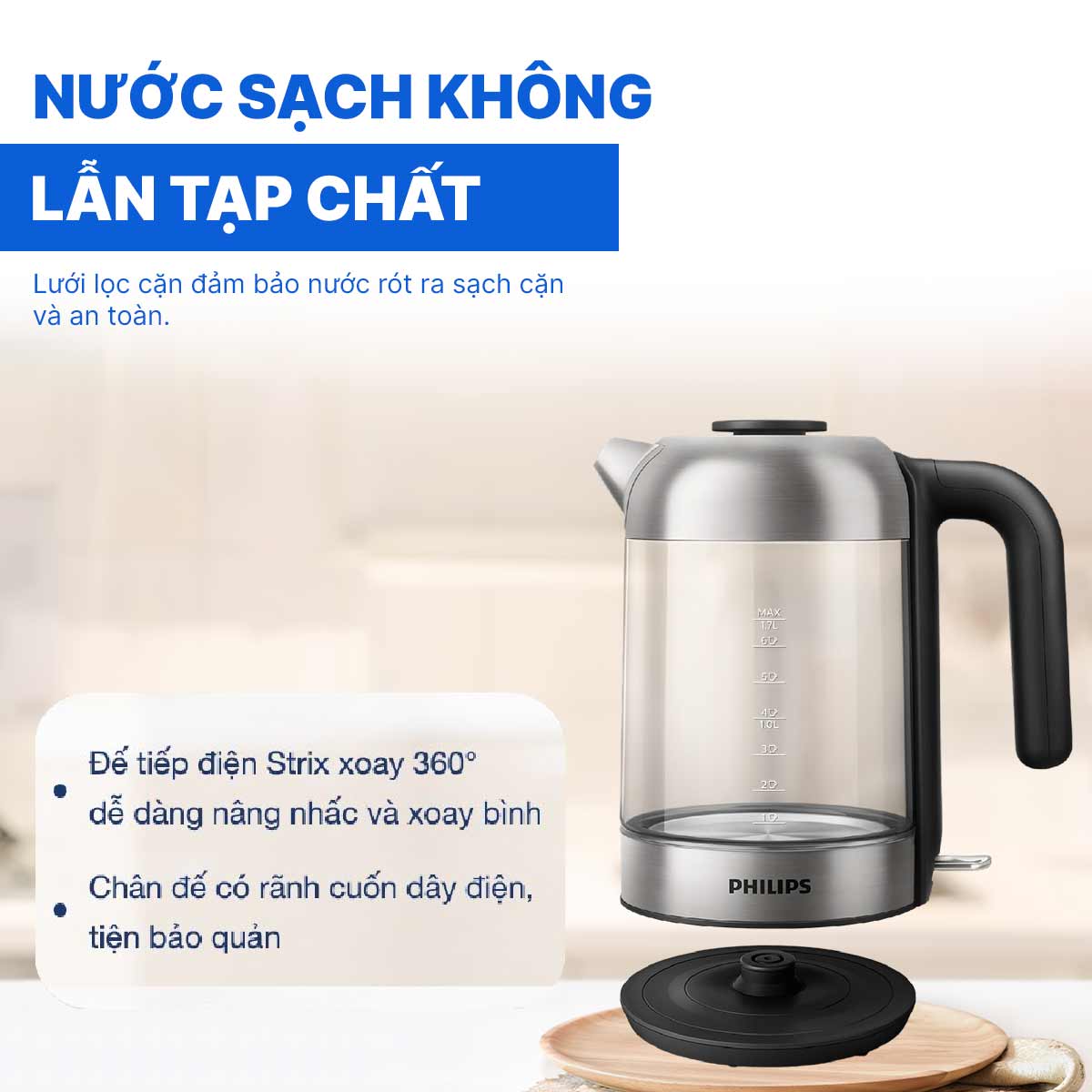 Ấm siêu tốc Philips trang bị đế tiếp điện Strix cao cấp – thương hiệu uy tín hàng đầu thế giới trong công nghệ tiếp điện. Đế có độ bền ấn tượng, giúp người dùng yên tâm về độ ổn định lâu dài. Thiết kế đế xoay 360 độ linh hoạt, cho phép dễ dàng nhấc lên hoặc đặt bình xuống ở bất kỳ góc nào, cực kỳ tiện lợi cho cả người thuận tay trái lẫn tay phải. Sự kết hợp giữa độ bền, an toàn và tính tiện dụng này góp phần nâng cao trải nghiệm sử dụng mỗi ngày.