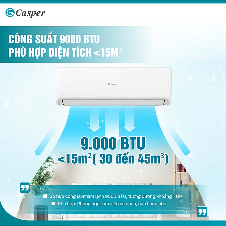 Điều hòa Casper SC-09FS36 sở hữu công suất làm lạnh 9000 BTU, tương đương khoảng 1 HP. Mức công suất này phù hợp để sử dụng trong các không gian có diện tích nhỏ dưới 15m² như: phòng ngủ, phòng làm việc cá nhân, cửa hàng nhỏ, phòng học tại nhà, phòng đọc sách… Với không gian như vậy, máy có thể làm mát nhanh chóng, duy trì nhiệt độ ổn định và tiết kiệm điện năng hiệu quả.