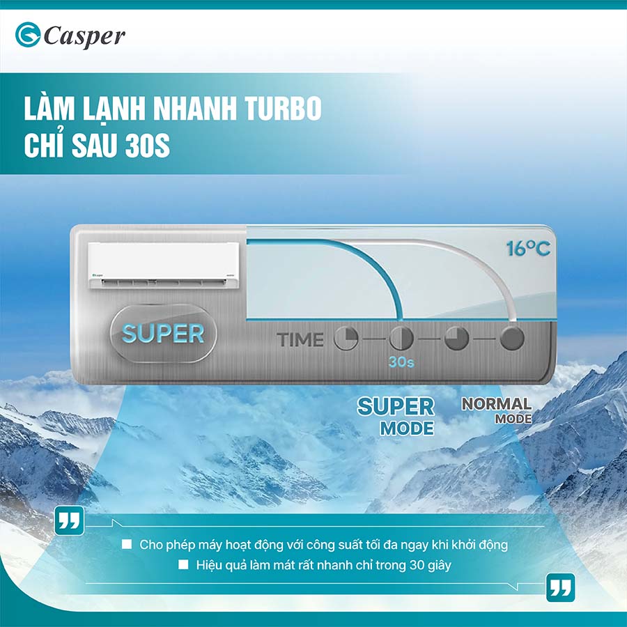 Điều hòa Casper SC-09FS36 được trang bị máy nén tiên tiến, cho phép máy hoạt động với công suất tối đa ngay khi khởi động. Nhờ đó, chỉ sau 30 giây, bạn đã có thể cảm nhận được luồng không khí mát lạnh lan tỏa đều khắp căn phòng. Đây là ưu điểm lý tưởng với người dùng sống trong khí hậu nóng nực, đặc biệt vào những ngày oi bức khi nhu cầu làm mát tức thì là rất cần thiết.