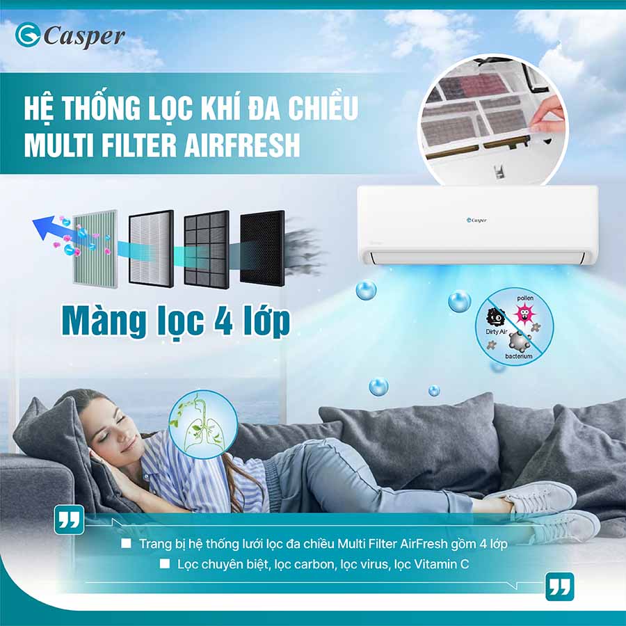 Điều hoà Casper 1 chiều 9000 BTU SC-09FS36 sở hữu hệ thống lưới lọc đa chiều Multi Filter AirFresh gồm 4 lớp màng lọc chuyên biệtmàng lọc Cacbon, màng lọc virus, màng lọc Vitamin C, màng lọc diệt khuẩn giúp bắt giữ và loại bỏ bụi bẩn, vi khuẩn, nấm mốc… hiệu quả mang đến bầu không khí trong lành.