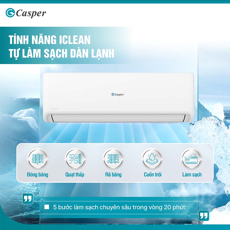 Điều hòa Casper SC-09FS36 được tích hợp chức năng iClean tự làm sạch dàn lạnh thông minh, giúp bảo vệ sức khỏe người dùng và tăng tuổi thọ thiết bị. Khi kích hoạt, máy sẽ tự động trải qua 5 bước làm sạch chuyên sâu trong vòng 20 phút: