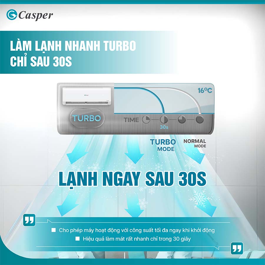 Điều hòa Casper SC-24FS33 được trang bị chế độ Turbo một tính năng giúp máy hoạt động với công suất tối đa ngay sau khi được kích hoạt, nhằm đẩy nhanh quá trình làm lạnh. Khi bạn nhấn nút Turbo trên remote, máy nén sẽ gia tăng tốc độ hoạt động, quạt gió trong dàn lạnh cũng vận hành mạnh mẽ hơn, từ đó giúp nhiệt độ trong phòng nhanh chóng đạt đến mức cài đặt chỉ trong 30 giây.