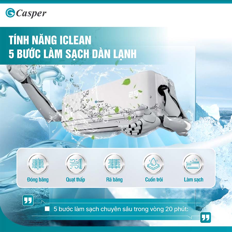 Điều hòa Casper SC-24FS33 được trang bị tính năng tự động làm sạch dàn lạnh iClean, hoạt động theo một quy trình thông minh giúp làm sạch bên trong dàn lạnh một cách hiệu quả mà không cần đến sự can thiệp của người dùng.
