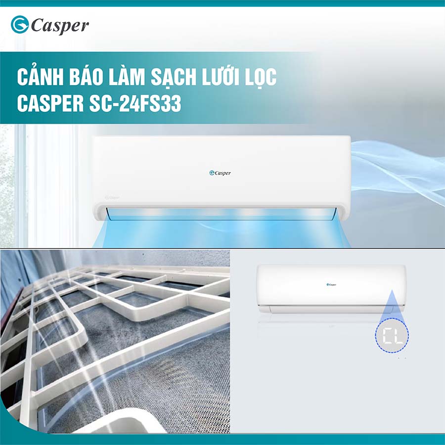 Sau một thời gian hoạt động, các tấm lọc bụi trong điều hòa sẽ tích tụ bụi bẩn, làm giảm hiệu quả lọc không khí và cản trở lưu thông gió. Để khắc phục tình trạng này, điều hòa Casper SC-24FS33 được trang bị tính năng cảnh báo làm sạch lưới lọc thông minh.
