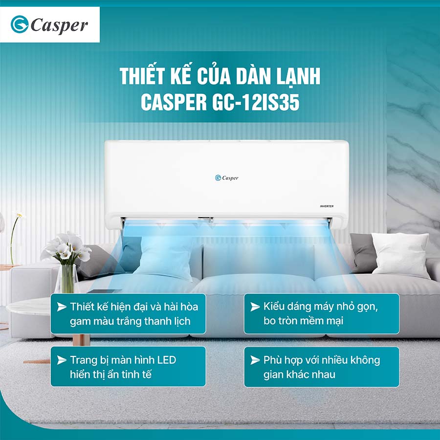 Điều hòa 1 chiều Inverter 1.5 HP Casper GC-12IS35 có thiết kế hiện đại, tinh tế. Dàn lạnh của máy điều hòa này được thiết kế với các đường bo cong mềm mại, tạo cảm giác nhẹ nhàng và thanh thoát. Đây là một chi tiết thiết kế nhỏ nhưng rất quan trọng, bởi nó giúp làm giảm bớt sự cứng nhắc, đồng thời mang đến một vẻ đẹp vừa cổ điển, vừa hiện đại. Những đường bo này còn làm tăng tính khí động học, giúp máy vận hành hiệu quả và êm ái hơn.