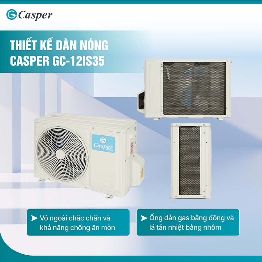 Dàn nóng của máy điều hòa Casper GC-12IS35 được thiết kế để đáp ứng hiệu quả và bền bỉ trong suốt quá trình sử dụng, ngay cả trong những điều kiện môi trường khắc nghiệt.