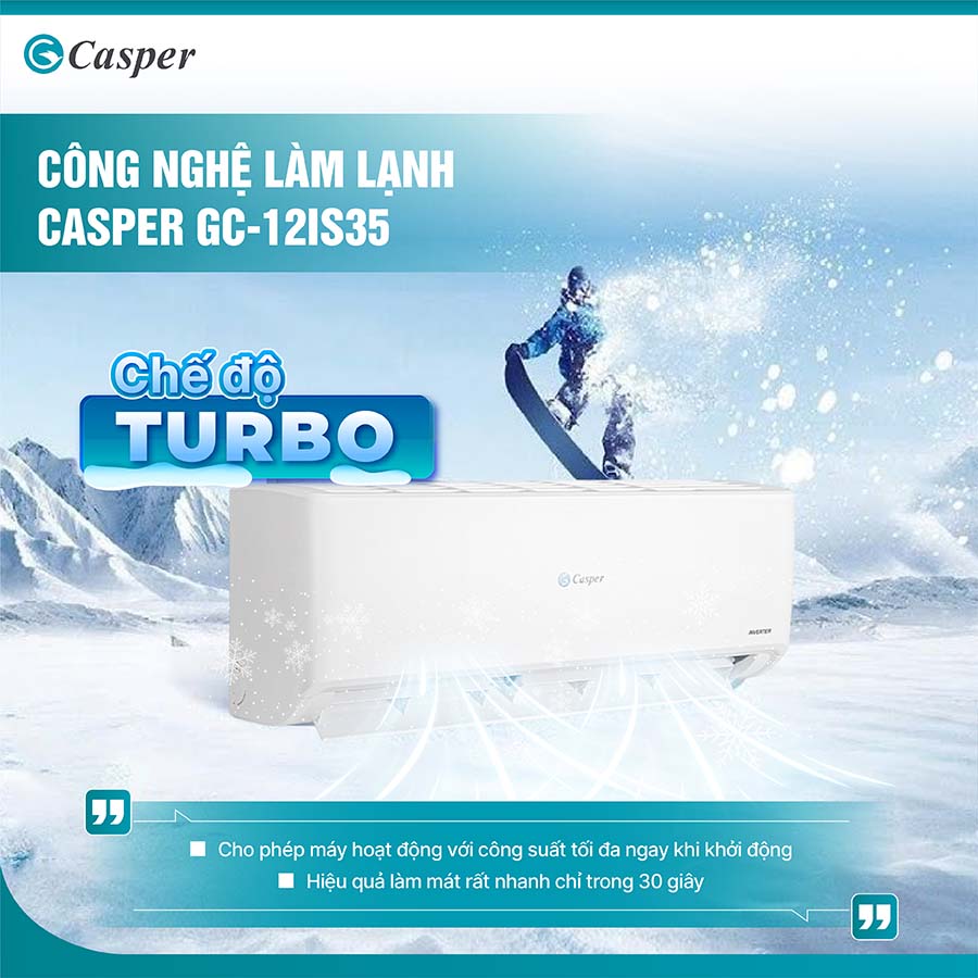 Một trong những tính năng nổi bật của máy lạnh Casper GC-12IS35 là công nghệ làm lạnh nhanh Turbo. Công nghệ này cho phép máy làm lạnh không gian nhanh chóng chỉ trong một thời gian ngắn, mang đến sự mát mẻ tức thì khi bạn cần. Khi bật chế độ Turbo, máy sẽ tăng tốc độ quạt và hoạt động của máy nén để tối ưu hóa khả năng làm lạnh, giúp bạn tận hưởng cảm giác dễ chịu ngay lập tức, đặc biệt trong những thời điểm thời tiết oi ả và nóng bức.