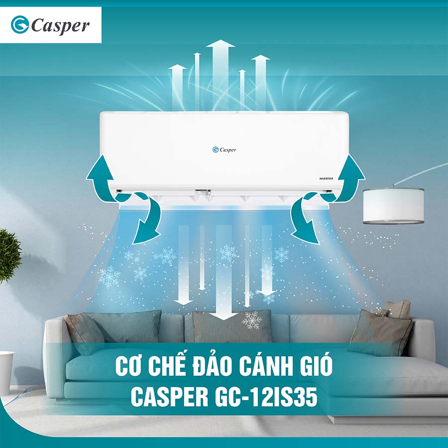 Với cơ chế đảo gió này, máy lạnh Casper GC-12IS35 giúp không khí lạnh lan tỏa đều khắp các góc phòng, tạo cảm giác dễ chịu và thoải mái cho người dùng mà không gây ra cảm giác lạnh tập trung tại một điểm. Điều này đặc biệt quan trọng khi sử dụng trong những phòng có không gian rộng hoặc khi cần làm lạnh nhanh chóng và đồng đều.