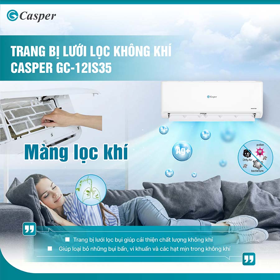 Máy lạnh Casper GC-12IS35 được trang bị lưới lọc bụi, một tính năng hữu ích giúp cải thiện chất lượng không khí trong phòng. Lưới lọc bụi có khả năng loại bỏ những bụi bẩn, vi khuẩn và các hạt mịn trong không khí, giúp mang lại bầu không khí trong lành và sạch sẽ cho không gian sống của bạn.