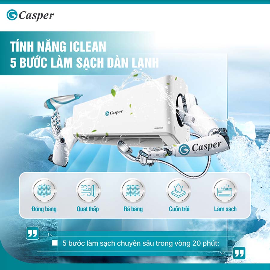 Máy lạnh Casper GC-12IS35 1.5 HP được trang bị tính năng tự động làm sạch iClean, một công nghệ tiên tiến giúp bảo vệ máy và nâng cao hiệu quả sử dụng. Cơ chế hoạt động của tính năng này rất thông minh và hiệu quả: máy sẽ đóng băng dàn lạnh, sau đó rã băng và sử dụng quá trình này để cuốn trôi bụi bẩn, vi khuẩn và các tạp chất tích tụ trong dàn lạnh. Điều này giúp làm sạch các bộ phận bên trong máy, đảm bảo không khí trong phòng luôn trong lành.