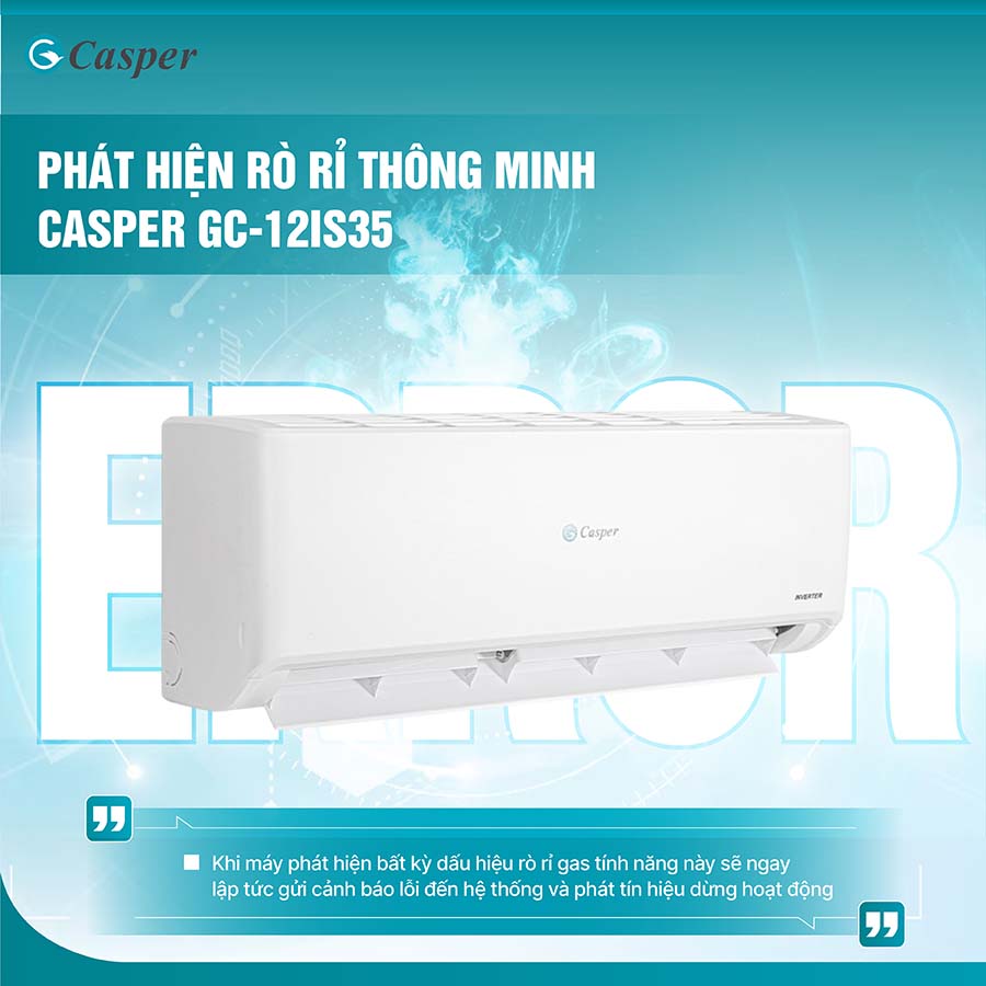 Tính năng phát hiện rò rỉ thông minh trên điều hòa Casper GC-12IS35nhằm đảm bảo an toàn tuyệt đối cho người sử dụng. Khi máy phát hiện bất kỳ dấu hiệu rò rỉ gas nào trong hệ thống, tính năng này sẽ ngay lập tức gửi cảnh báo lỗi đến hệ thống trung tâm và phát tín hiệu dừng hoạt động để tránh những sự cố có thể xảy ra do việc thiếu gas hoặc rò rỉ, bảo vệ hệ thống máy lạnh cũng như sức khỏe người dùng. Việc dừng hoạt động khi phát hiện rò rỉ gas không chỉ giúp đảm bảo sự an toàn cho gia đình mà còn ngăn ngừa những thiệt hại về tài sản có thể phát sinh từ các sự cố ngoài ý muốn.