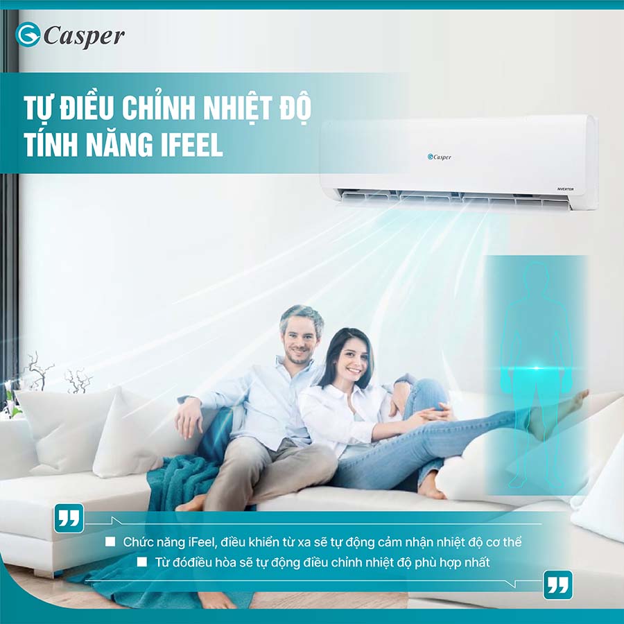 Điều hòa Casper TC-24IS36 được trang bị công nghệ điều chỉnh nhiệt độ iFeel, một tính năng hiện đại giúp mang lại sự thoải mái tối đa cho người sử dụng. Với chức năng này, máy điều hòa có khả năng cảm nhận nhiệt độ của người dùng thông qua bộ phận cảm biến nhiệt được tích hợp trên điều khiển từ xa.