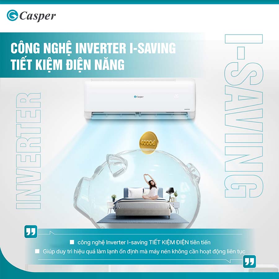 Điều hòa Casper 1 chiều TC-24IS36 được trang bị công nghệ Inverter I-saving, một công nghệ tiết kiệm điện tiên tiến, giúp bạn giảm thiểu chi phí điện năng hàng tháng mà vẫn đảm bảo hiệu quả làm lạnh tối ưu. Công nghệ này hoạt động thông qua việc điều chỉnh nhiệt độ cài đặt theo đường hình xoắn, thay vì đường thẳng như các hệ thống điều hòa truyền thống. Điều này có nghĩa là khi bạn thay đổi nhiệt độ, máy nén không phải thay đổi hoạt động quá nhiều, giúp giảm thiểu sự tiêu tốn điện năng không cần thiết.