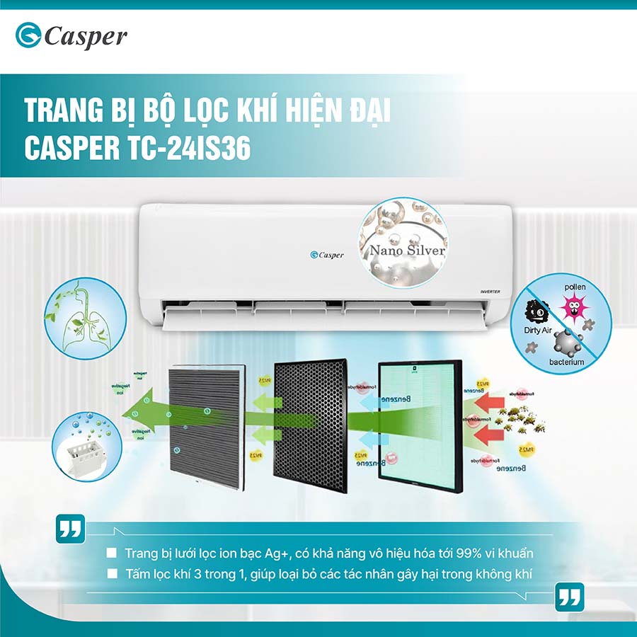 Với những tính năng này, điều hòa Casper TC-24IS36 không chỉ là một sản phẩm làm mát thông thường, mà còn là một trợ thủ đắc lực trong việc bảo vệ sức khỏe và tạo ra môi trường sống trong lành, an toàn cho bạn và gia đình.