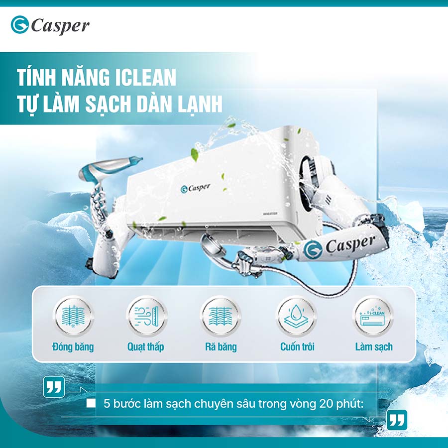Với thiết kế bền bỉ này, điều hòa Casper không chỉ mang lại hiệu suất làm lạnh ổn định, mà còn đảm bảo rằng bạn sẽ không phải lo lắng về việc bảo trì hay sửa chữa thường xuyên, dù ở những khu vực có điều kiện khí hậu khắc nghiệt. Điều này giúp người dùng yên tâm hơn khi lựa chọn sản phẩm cho không gian sống của mình.