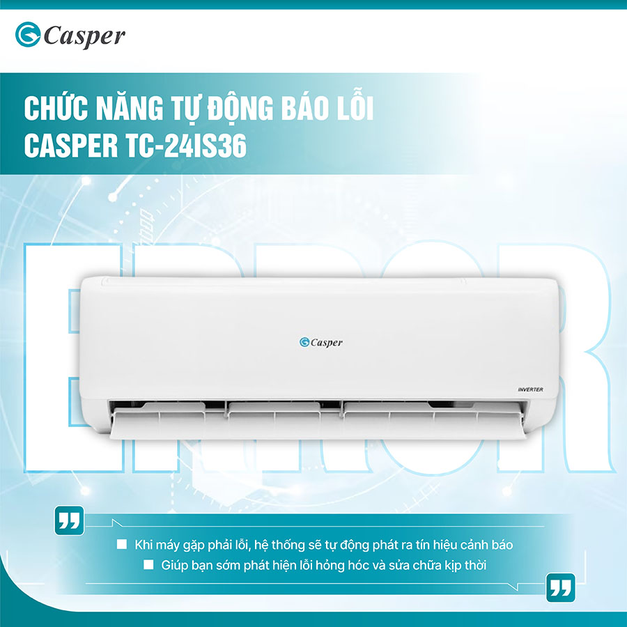 Điều hòa Casper TC-24IS36 được trang bị chức năng tự động báo lỗi, giúp người sử dụng phát hiện và xử lý sự cố một cách nhanh chóng. Khi máy gặp phải bất kỳ lỗi nào trong quá trình hoạt động, hệ thống sẽ tự động phát ra tín hiệu cảnh báo. Điều này giúp bạn dễ dàng nhận biết tình trạng của máy và có thể thực hiện các biện pháp sửa chữa hoặc bảo trì kịp thời, tránh để sự cố kéo dài, ảnh hưởng đến hiệu suất làm lạnh và tuổi thọ của thiết bị.