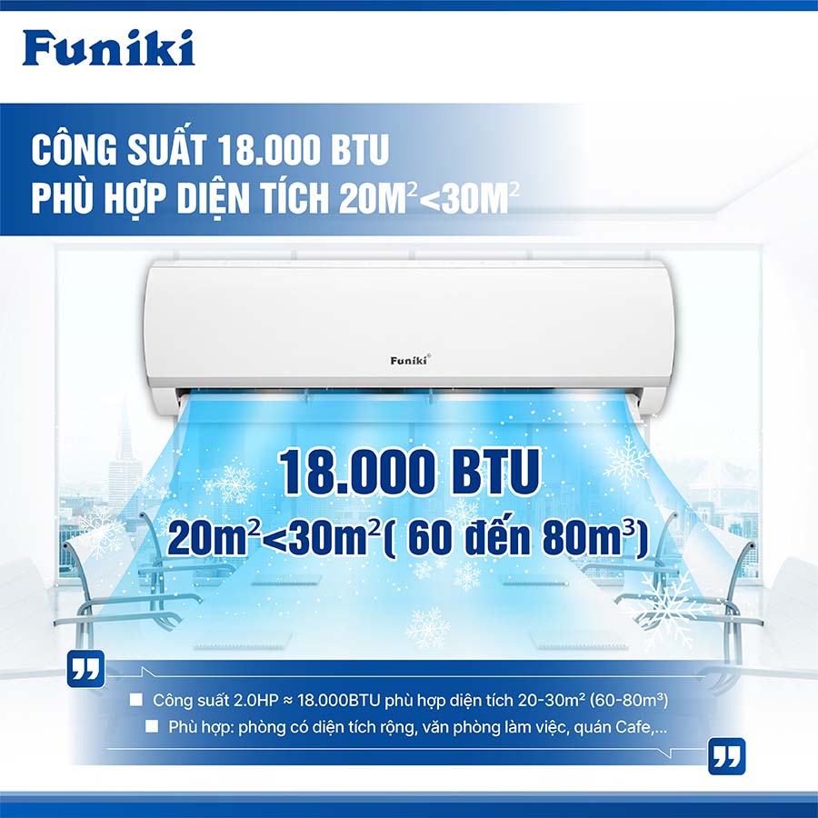 Sản phẩm này mang lại sự tiện nghi tối ưu cho các căn phòng có diện tích từ 20 – 30m², nhờ vào công suất 18000 BTU. Đây là công suất lý tưởng để đáp ứng nhu cầu làm mát cho những không gian rộng như phòng khách, phòng họp hay văn phòng làm việc, giúp duy trì không khí mát mẻ, dễ chịu mà không tốn quá nhiều năng lượng.