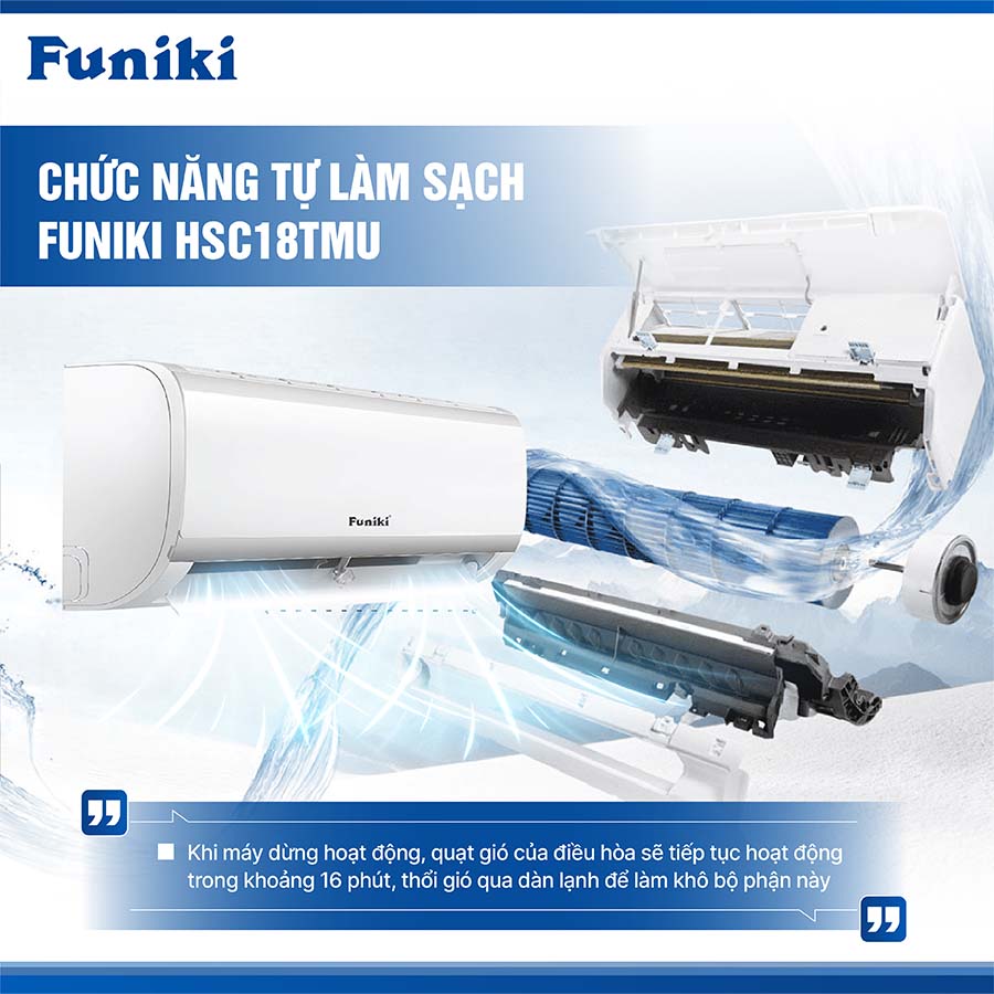 Điều hòa Funiki HSC18TMU được trang bị tính năng tự động làm sạch dàn lạnh, giúp máy vận hành êm ái và bền bỉ hơn. Khi bạn tắt máy, cánh quạt sẽ tiếp tục hoạt động trong một thời gian ngắn để hong khô dàn lạnh, ngăn ngừa sự phát triển của nấm mốc và vi khuẩn. Điều này không chỉ giúp duy trì hiệu suất làm lạnh ổn định mà còn đảm bảo không khí trong phòng luôn sạch sẽ và trong lành.