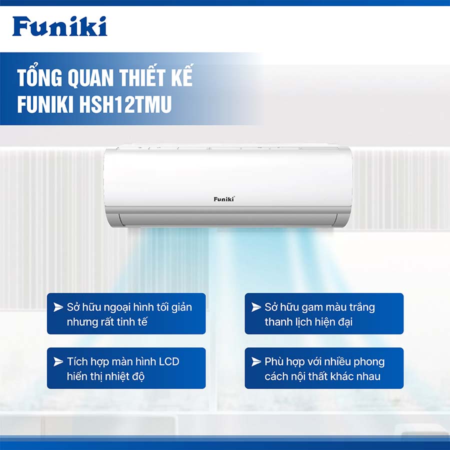 Về mặt thiết kế, Funiki HSH12TMU sở hữu ngoại hình tối giản nhưng không kém phần tinh tế với gam màu trắng thanh lịch, phù hợp với nhiều phong cách nội thất từ hiện đại đến truyền thống. Bề mặt máy được hoàn thiện tỉ mỉ, đường nét mềm mại, không chỉ mang tính thẩm mỹ cao mà còn dễ dàng vệ sinh, lau chùi. Đặc biệt, thiết bị còn tích hợp màn hình LCD hiển thị nhiệt độ ngay trên thân máy, cho phép người dùng quan sát thông tin hoạt động nhanh chóng, dễ dàng điều chỉnh chế độ mong muốn chỉ trong vài thao tác đơn giản. Thiết kế này không chỉ tăng tính tiện nghi mà còn giúp người dùng kiểm soát tốt hơn tình trạng môi trường trong phòng ở mọi thời điểm.