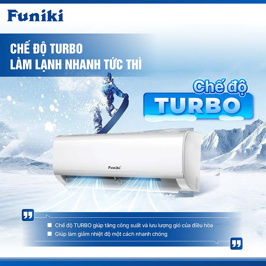 Với chế độ Turbo, điều hòa Funiki không chỉ đáp ứng nhanh nhu cầu làm lạnh mà còn thể hiện rõ khả năng làm việc linh hoạt, hiệu quả trong nhiều tình huống sử dụng thực tế.
