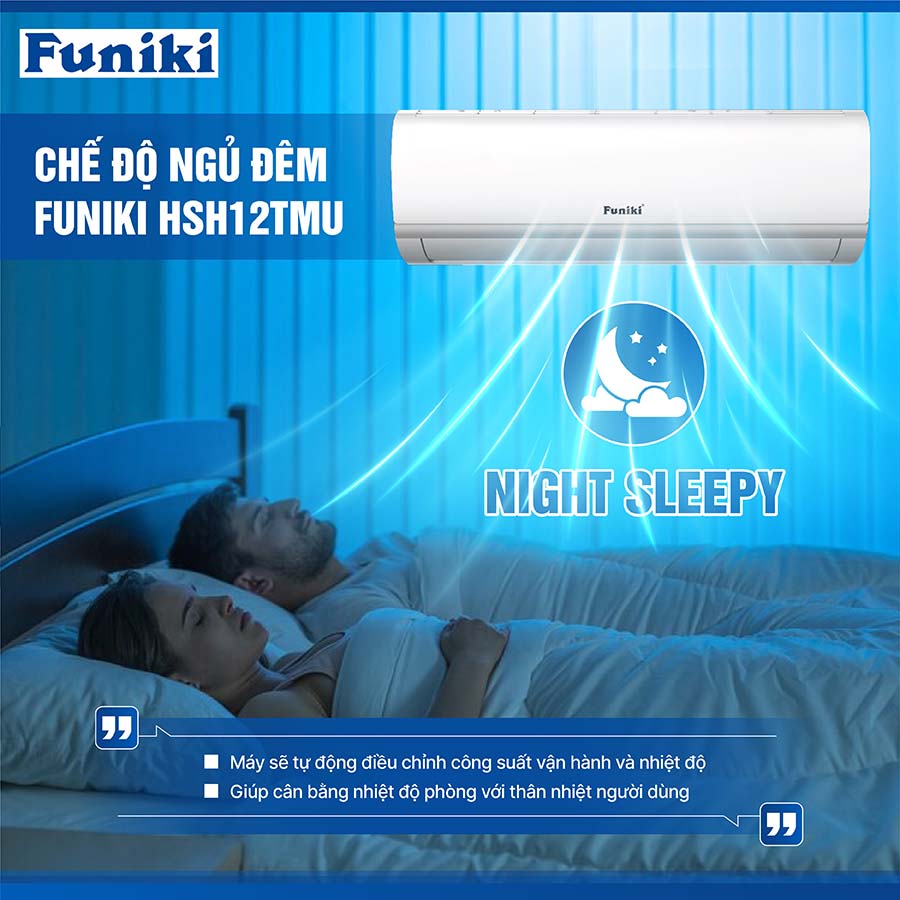 Với mong muốn mang đến trải nghiệm sử dụng thoải mái và dễ chịu nhất cho người dùng, điều hòa Funiki HSH12TMU được tích hợp chế độ ngủ đêm thông minh – một tính năng đặc biệt quan trọng đối với các gia đình có người già, trẻ nhỏ hoặc những người nhạy cảm với sự thay đổi nhiệt độ.