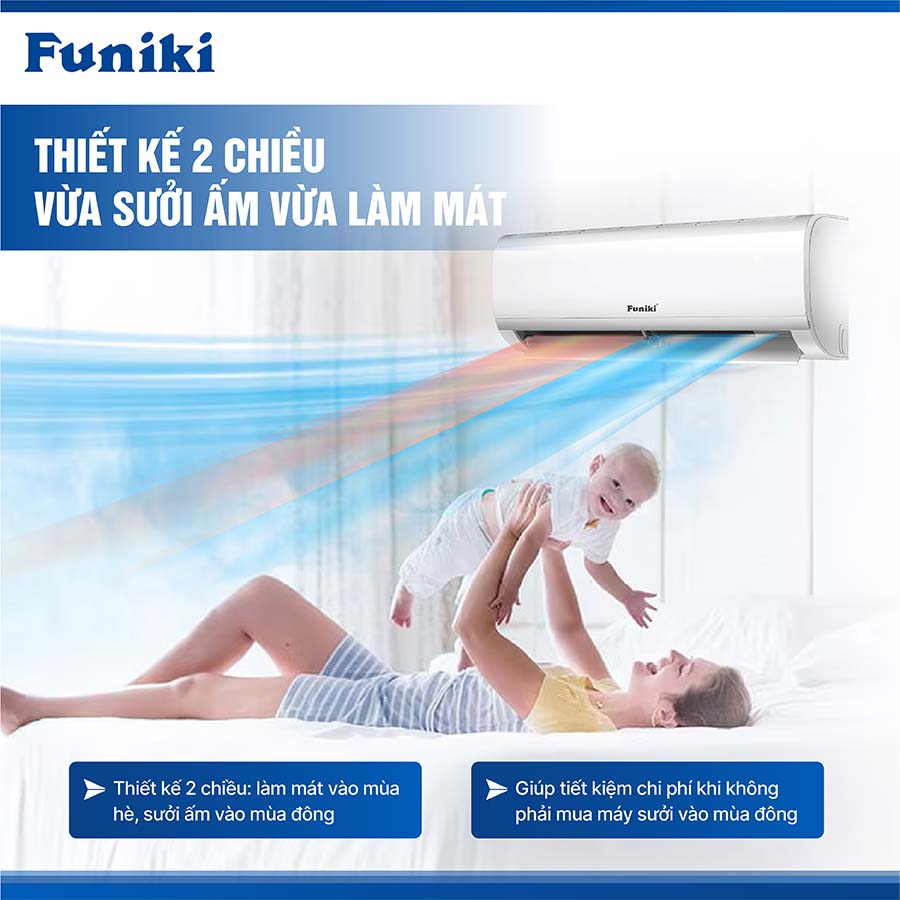 Điều Hòa 2 Chiều Funiki 9.000BTU HSH10TMU được thiết kế đặc biệt để mang đến sự tiện nghi tối ưu cho người sử dụng với khả năng vừa làm mát vào mùa hè, vừa sưởi ấm vào mùa đông. Đây là giải pháp lý tưởng cho những gia đình ở khu vực miền Bắc hoặc các vùng có khí hậu lạnh, vì bạn có thể sử dụng một thiết bị duy nhất cho cả hai chức năng mà không cần phải trang bị thêm các thiết bị sưởi ấm riêng biệt như máy sưởi dầu hay quạt sưởi, giúp tiết kiệm không gian và chi phí.