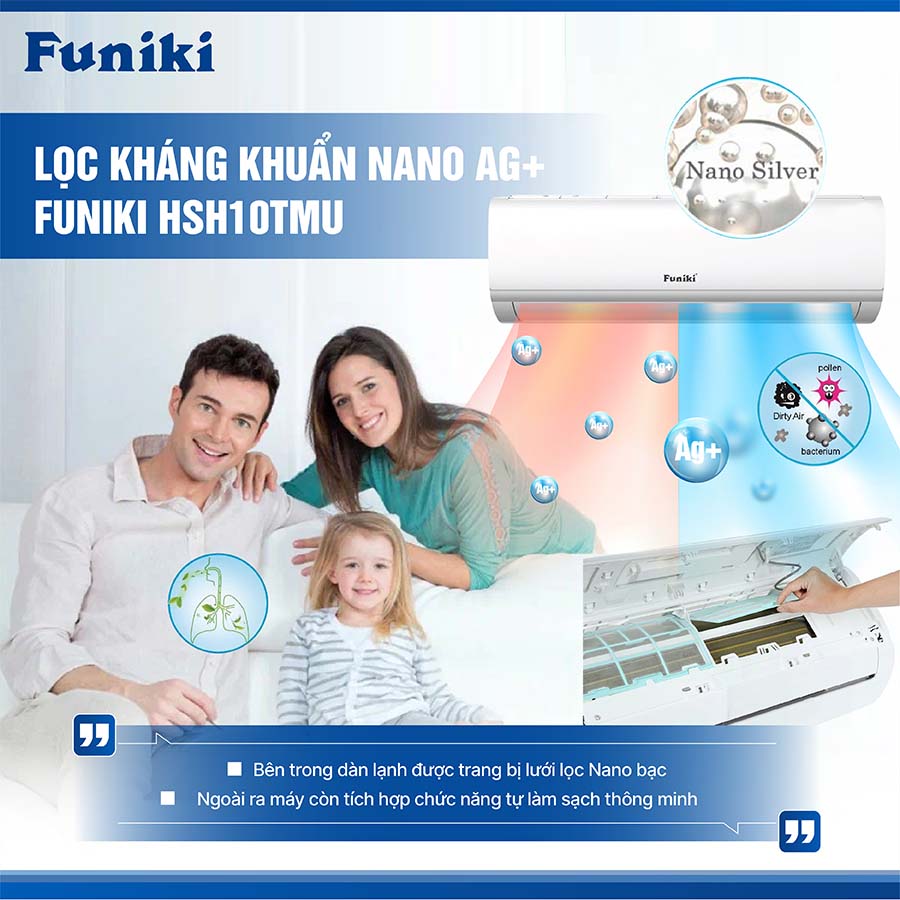 Bên cạnh đó, việc sử dụng nano bạc giúp ngăn ngừa mùi hôi và các tác nhân gây dị ứng, mang lại cảm giác dễ chịu và an toàn hơn khi sử dụng điều hòa trong thời gian dài. Vì vậy, lưới lọc Nano bạc trên điều hòa Funiki HSH10TMU không chỉ mang lại sự thoải mái mà còn đảm bảo một môi trường sống khỏe mạnh cho mọi thành viên trong gia đình.