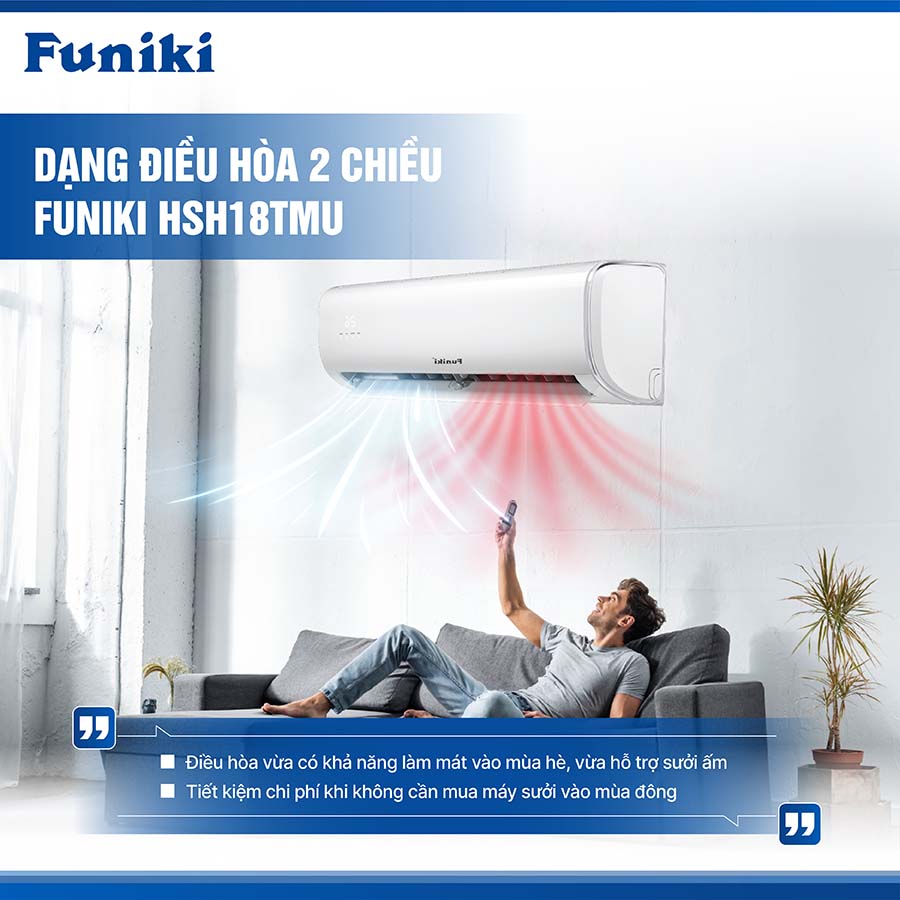 Điều hòa Funiki HSH18TMU được tích hợp cơ chế vận hành 2 chiều, cho phép máy vừa làm mát vào mùa hè oi bức, vừa có thể sưởi ấm vào mùa đông lạnh giá. Đây là giải pháp lý tưởng dành cho các gia đình sinh sống tại khu vực miền Bắc hay những vùng có khí hậu phân hóa rõ rệt theo mùa. Với khả năng làm mát – sưởi ấm linh hoạt chỉ trong một thiết bị duy nhất, người dùng không còn cần phải đầu tư thêm quạt sưởi hay lò sưởi, từ đó tiết kiệm chi phí mua sắm và điện năng tiêu thụ một cách đáng kể. Không chỉ giúp cân bằng nhiệt độ môi trường sống trong suốt cả năm, thiết kế 2 chiều còn góp phần nâng cao sự tiện nghi, đảm bảo không gian sinh hoạt luôn dễ chịu và phù hợp với nhu cầu của từng thời điểm trong ngày hoặc mùa.