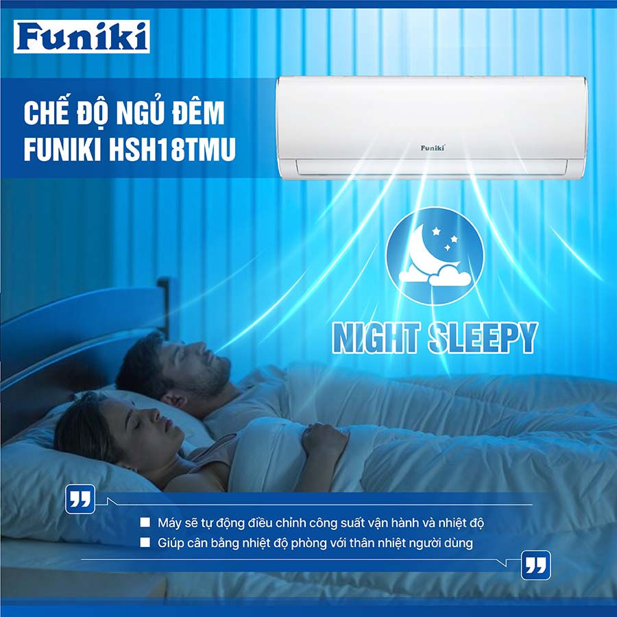 Điều hòa Funiki 2 chiều 18.000 BTU HSH18TMU được trang bị chế độ Sleep – một tính năng thông minh giúp tự động điều chỉnh nhiệt độ về đêm sao cho phù hợp với thân nhiệt người dùng. Khi kích hoạt, máy sẽ dần tăng nhiệt độ sau mỗi giờ vận hành, ngăn ngừa tình trạng quá lạnh vào ban đêm, nguyên nhân thường khiến người dùng tỉnh giấc, mất ngủ hoặc bị nhiễm lạnh. Đây là tính năng đặc biệt hữu ích với người lớn tuổi, trẻ nhỏ hoặc những người có sức đề kháng yếu, giúp giấc ngủ sâu và liên tục hơn mà vẫn đảm bảo sự dễ chịu, thoải mái. Đồng thời, cơ chế vận hành tối ưu này còn giúp tiết kiệm điện năng đáng kể do máy không cần duy trì mức công suất cao liên tục trong suốt đêm.