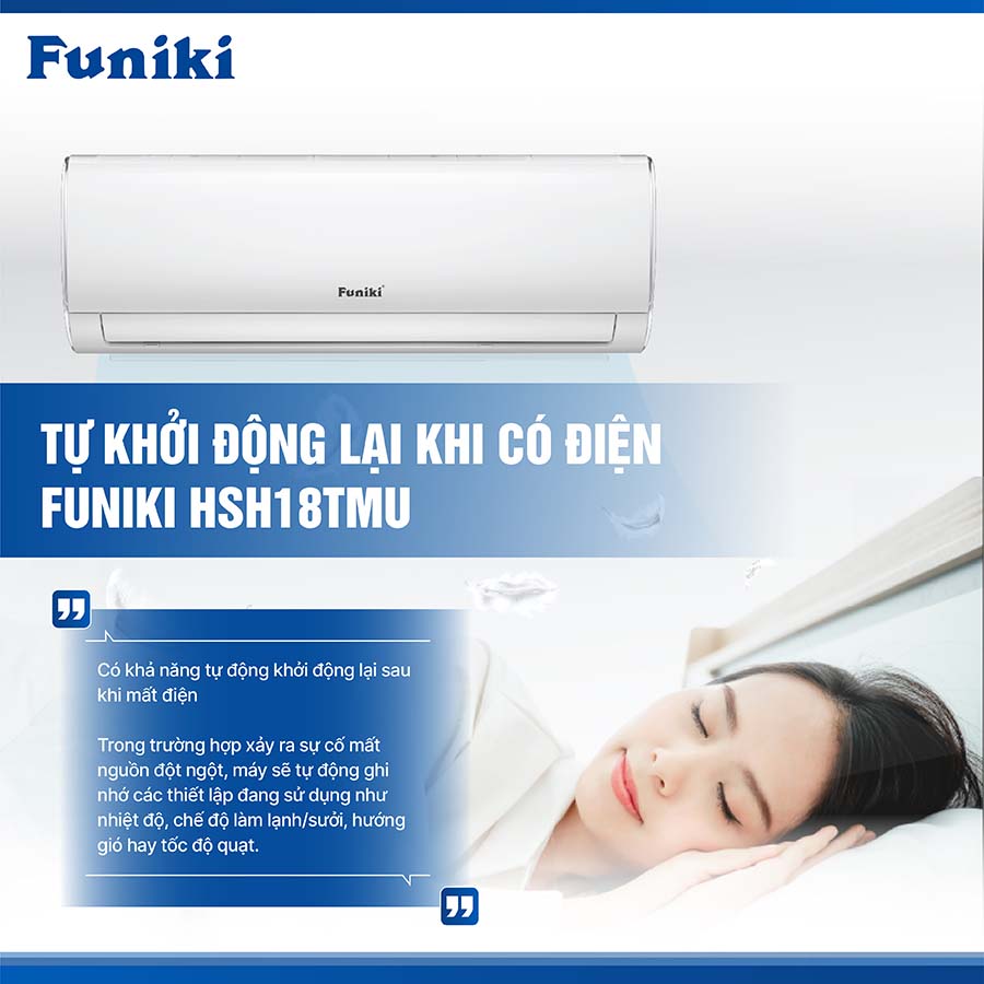 Một điểm cộng đáng giá trên điều hòa Funiki 2 chiều HSH18TMU chính là khả năng tự động khôi phục hoạt động sau khi mất điện. Khi xảy ra sự cố cúp điện đột ngột, máy sẽ lập tức lưu lại các thiết lập đang sử dụng như: nhiệt độ cài đặt, chế độ làm mát/sưởi, hướng gió, tốc độ quạt… và chuyển sang trạng thái chờ. Ngay khi nguồn điện được cấp trở lại, điều hòa sẽ tự động khởi động lại với đúng các thông số trước đó mà không cần người dùng thao tác lại từ đầu. Tính năng này không chỉ tiết kiệm thời gian, tăng tính tiện lợi mà còn đặc biệt hữu ích vào ban đêm hoặc khi bạn vắng nhà, đảm bảo môi trường luôn duy trì ở mức nhiệt độ dễ chịu và ổn định.