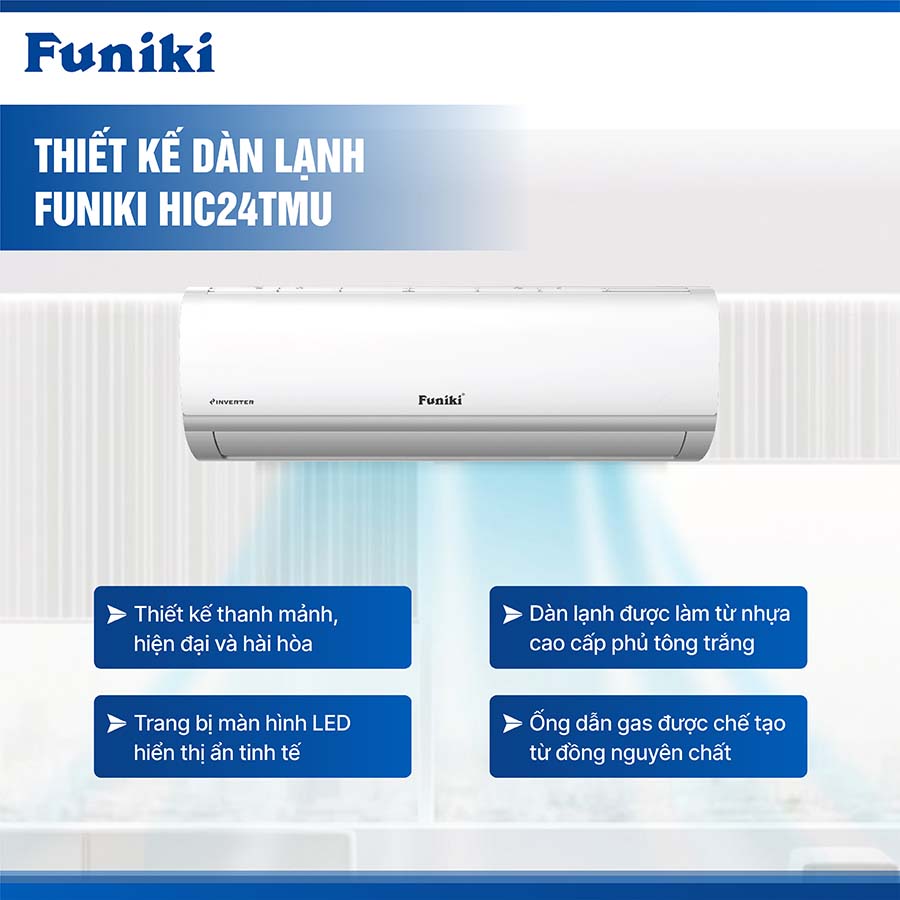 Dòng điều hòa Funiki inverter 24000 BTU 1 chiều HIC24TMU được thiết kế theo phong cách hiện đại với kiểu dáng chữ nhật quen thuộc, dễ lắp đặt và phù hợp với nhiều không gian nội thất. Tông màu trắng tinh tế không chỉ tạo cảm giác sạch sẽ, trang nhã mà còn góp phần làm nổi bật vẻ đẹp sang trọng của căn phòng, đặc biệt phù hợp với những không gian như phòng khách, phòng làm việc hay phòng họp chuyên nghiệp.