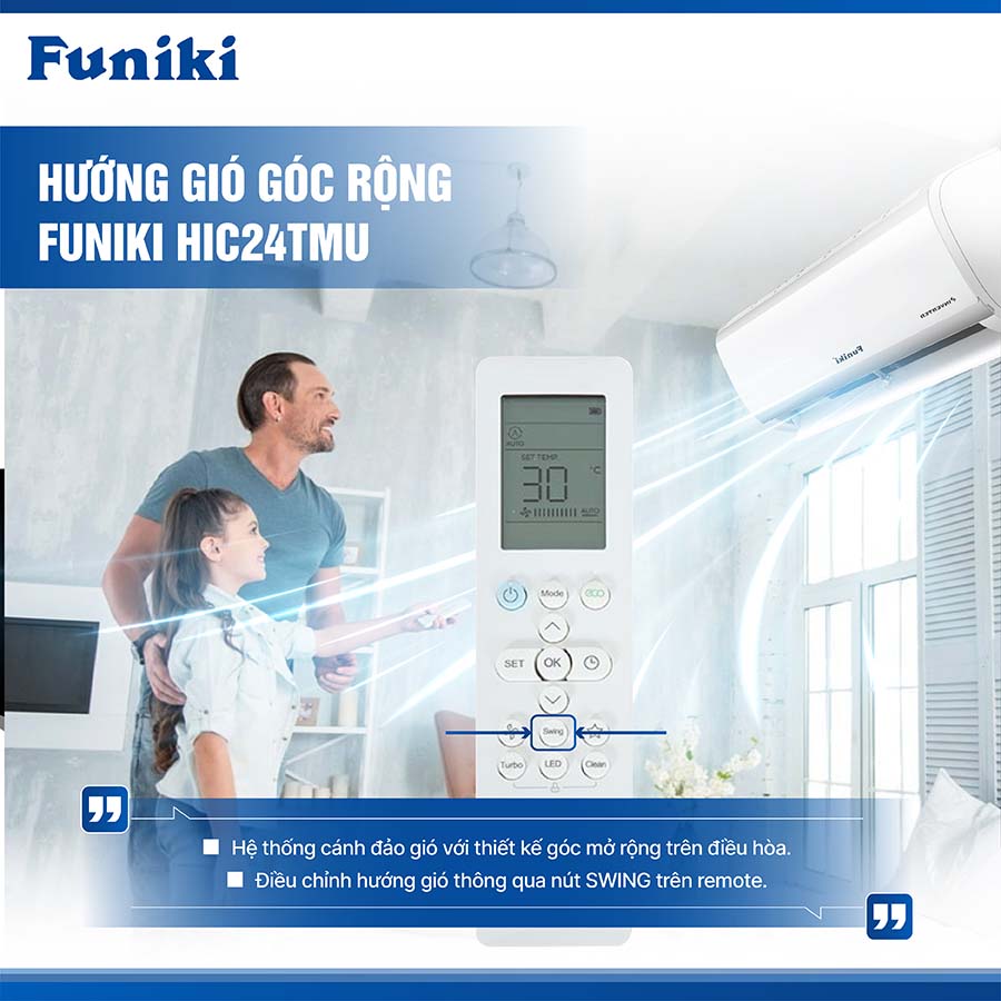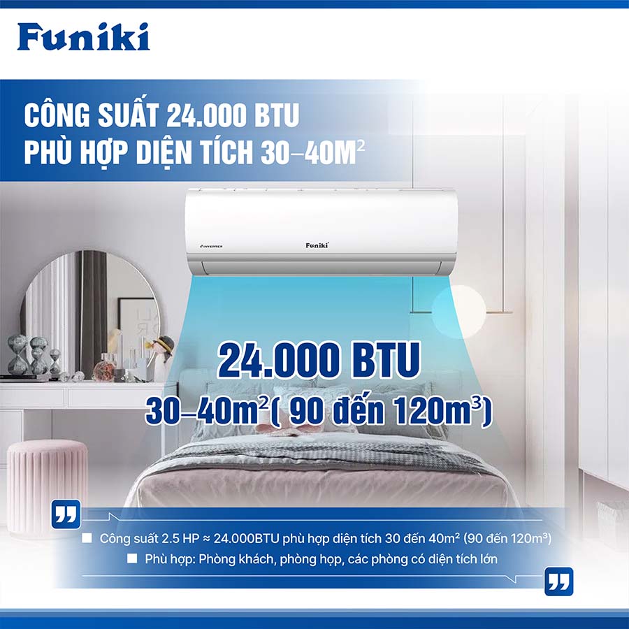 Với công suất làm lạnh lên tới 24.000 BTU (2.5 HP), điều hòa Funiki HIC24TMU là lựa chọn lý tưởng cho những không gian rộng từ 30 – 40m² (tương đương khoảng 90 – 120m³). Đây là mức công suất mạnh mẽ, đáp ứng tốt nhu cầu làm mát cho các khu vực có diện tích lớn như phòng khách, phòng họp, văn phòng làm việc, phòng sinh hoạt chung hoặc phòng ngủ master.