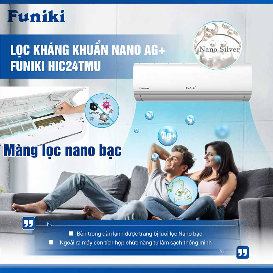 Điều hòa được trang bị hệ thống lưới lọc khử khuẩn Nano Ag, trong đó các hạt nano bạc (Ag+) được tích hợp trên bề mặt màng lọc. Khi điều hòa vận hành, các hạt nano này sẽ giải phóng ion bạc một chất có đặc tính kháng khuẩn mạnh, có khả năng phá vỡ màng tế bào của vi khuẩn và ức chế hoạt động của các loại nấm mốc, vi sinh vật gây bệnh trong không khí.