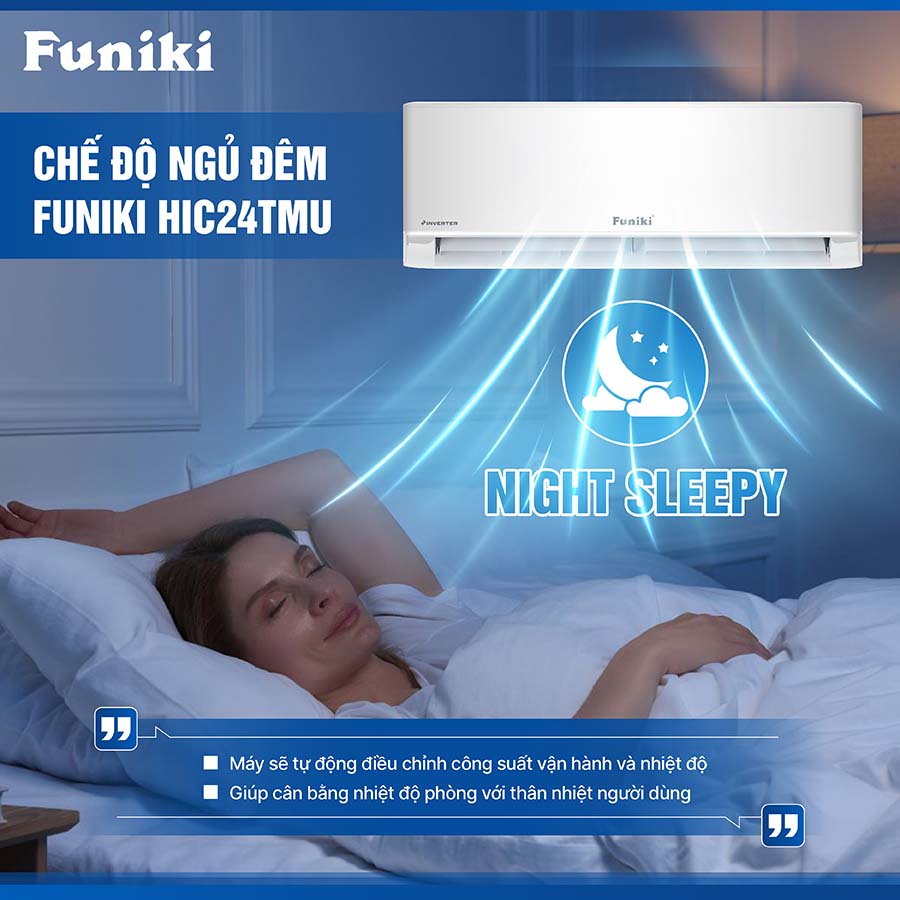 Điều hòa Funiki HIC24TMU được tích hợp chế độ Sleep Mode – một tính năng đặc biệt giúp điều chỉnh nhiệt độ dần dần theo thân nhiệt người dùng và điều kiện môi trường trong suốt thời gian ngủ. Khi kích hoạt, máy sẽ điều chỉnh công suất để phù hợp với nhiệt độ ngoài trời và thân nhiệt người dùng nhằm tránh tình trạng lạnh buốt vào ban đêm – nguyên nhân thường khiến người dùng dễ bị thức giấc giữa chừng.