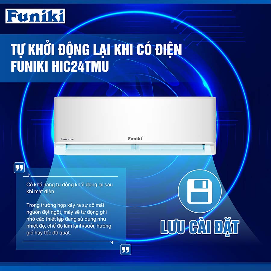 Điều hòa Funiki Inverter HIC24TMU được trang bị tính năng tự động làm sạch dàn lạnh, một tiện ích giúp kéo dài tuổi thọ cho thiết bị và duy trì chất lượng không khí trong phòng. Sau khi tắt máy, hệ thống sẽ giữ cho quạt gió tiếp tục hoạt động trong khoảng 16 phút nhằm hong khô dàn lạnh, loại bỏ độ ẩm còn tồn đọng.