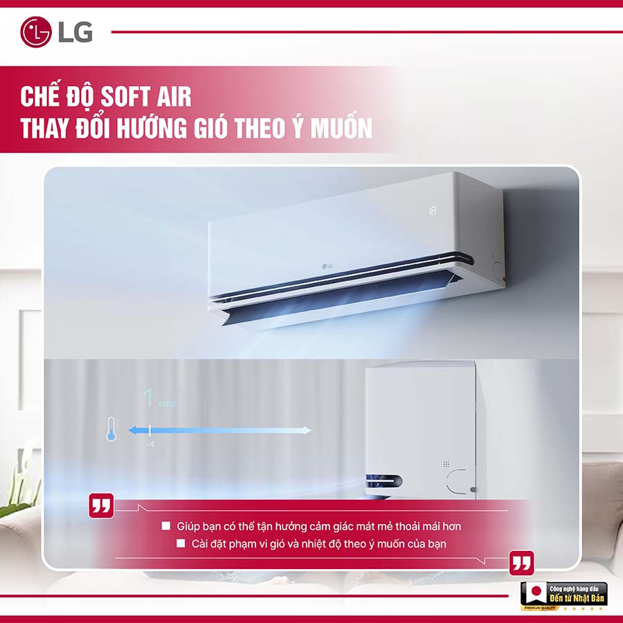 Chế độ Soft Air trên điều hòa LG mang đến trải nghiệm làm mát êm ái, nhẹ nhàng, lý tưởng cho những ai yêu thích sự dễ chịu và thư giãn trong từng luồng gió. Với khả năng tùy chỉnh hướng gió linh hoạt, bạn hoàn toàn có thể điều chỉnh phạm vi gió và mức nhiệt độ theo đúng nhu cầu cá nhân – từ làn gió dịu nhẹ cho giấc ngủ sâu đến hơi lạnh lan tỏa đều khắp phòng khi cần làm mát nhanh. Soft Air không chỉ là tính năng làm mát, mà còn là giải pháp cá nhân hóa không gian sống, giúp bạn tận hưởng sự thoải mái theo cách riêng của mình.