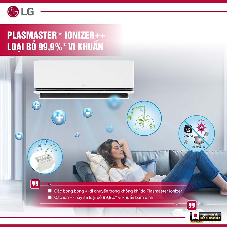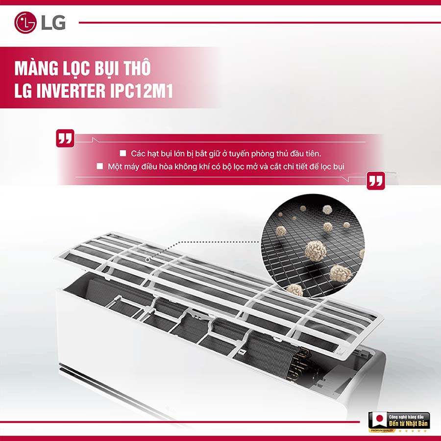 Điều hòa LG Inverter 12000BTU IPC12M1 không chỉ làm mát hiệu quả mà còn chú trọng đến chất lượng không khí trong không gian sống. Sản phẩm được trang bị màng lọc sơ cấp kết hợp bộ lọc bụi mịn, giúp loại bỏ các hạt bụi siêu nhỏ, vi khuẩn và tác nhân gây hại trong không khí, mang lại môi trường trong lành và an toàn hơn cho sức khỏe của cả gia đình.