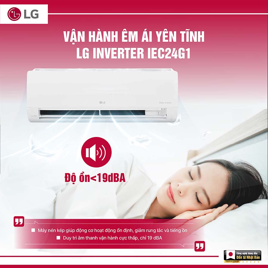 Không chỉ mạnh mẽ về khả năng làm lạnh, LG IEC24G1 còn tích hợp bộ lọc kháng khuẩn và chế độ ngủ đêm thông minh, tự động điều chỉnh nhiệt độ phù hợp để bạn có giấc ngủ sâu trọn vẹn. Với máy nén DUAL Inverter Compressor™, đây là lựa chọn hoàn hảo để biến mỗi căn phòng thành thiên đường mát lạnh, sẵn sàng đáp ứng nhu cầu làm mát ngay cả khi nhiệt độ ngoài trời ở mức cao nhất.