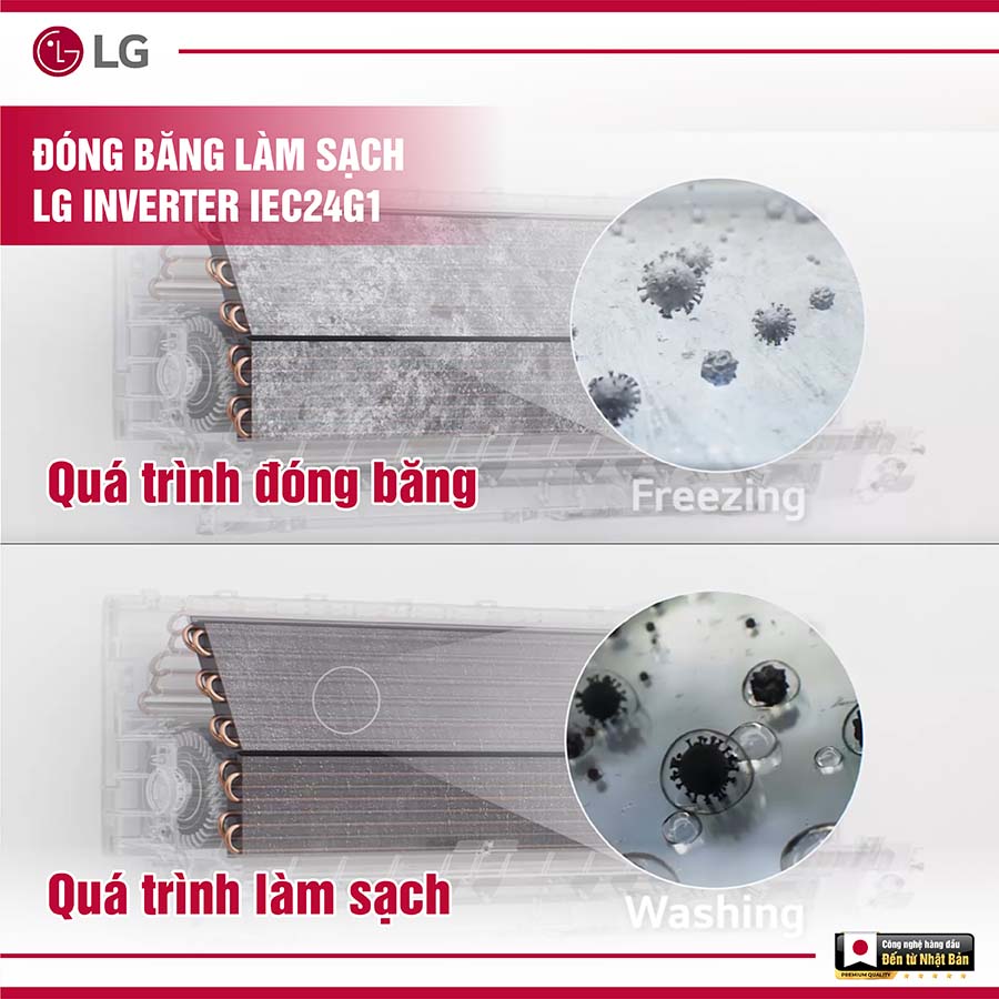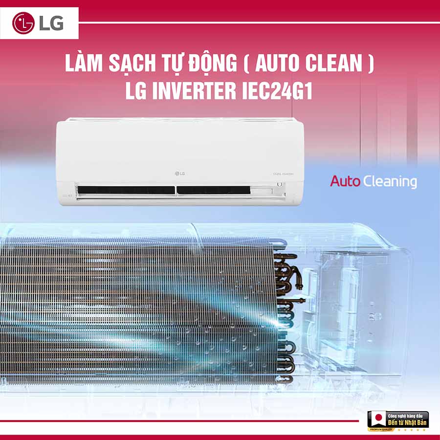 Tính năng Auto Cleaning trên điều hòa LG Inverter 2.5 HP IEC24G1 là giải pháp tự động vệ sinh dàn lạnh, giúp loại bỏ bụi bẩn, vi khuẩn và nấm mốc tích tụ sau mỗi chu kỳ hoạt động. Khi kích hoạt, máy sẽ tự động đóng băng bề mặt dàn lạnh, sau đó rã băng để cuốn trôi các tạp chất, rồi hong khô hoàn toàn mà không cần tháo lắp thủ công. Nhờ vậy, chất lượng không khí luôn trong lành, tránh được mùi hôi khó chịu và tác nhân gây bệnh đường hô hấp