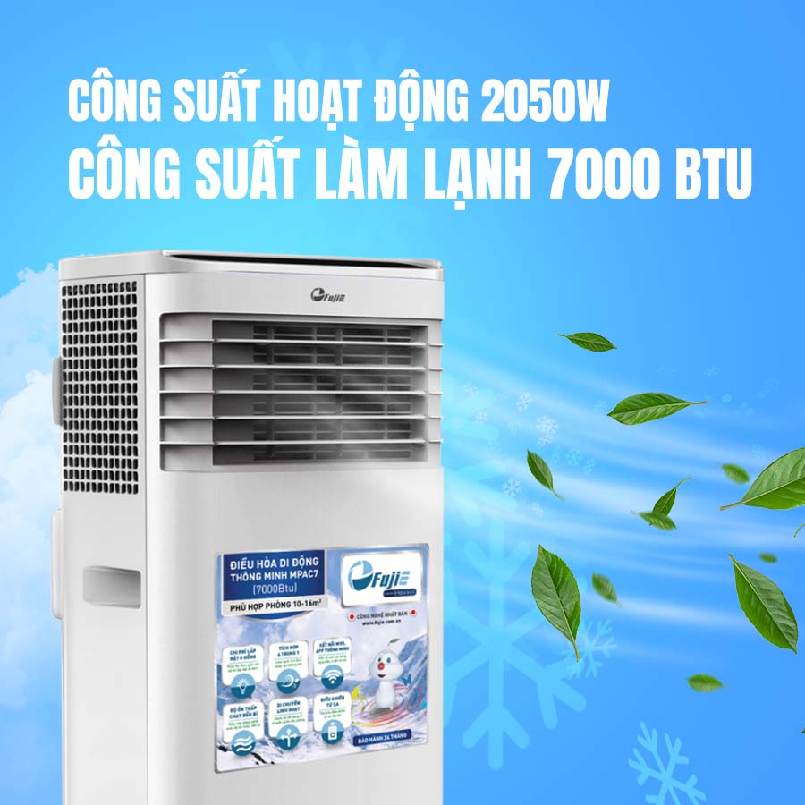 Máy điều hòa di động thông minh FujiE MPAC7 với công suất hoạt động 2050W hoạt động lên đến 7.000BTU , bộ phận bơm nén gas lạnh có hiệu suất làm mát vượt trội mang lại khả năng làm lạnh nhanh chóng và hiệu quả.