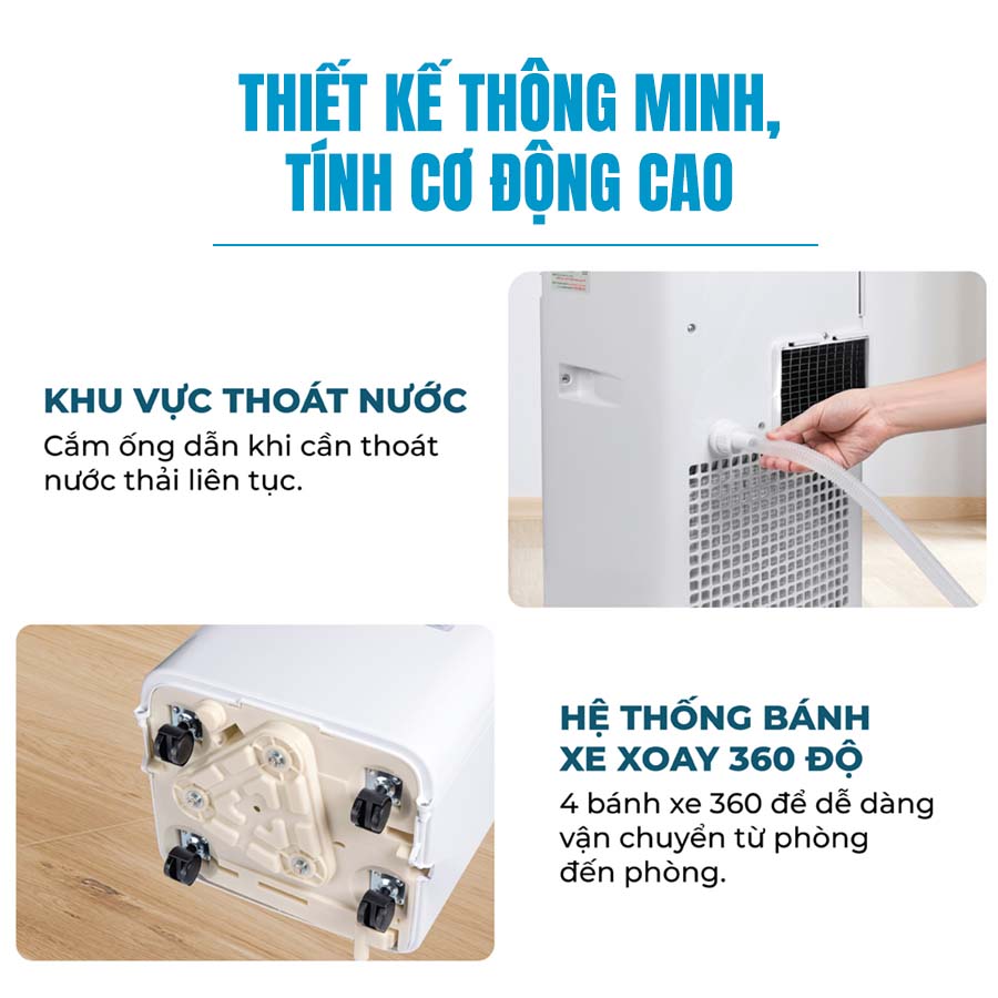 Một yếu tố quan trọng khác giúp FujiE MPAC7 dễ dàng thích ứng với nhu cầu sử dụng là khả năng di chuyển linh hoạt. Sản phẩm được trang bị bánh xe 360 độ, cho phép người dùng dễ dàng di chuyển máy từ vị trí này sang vị trí khác mà không gặp bất kỳ khó khăn nào. Điều này không chỉ giúp tiết kiệm không gian mà còn giúp người sử dụng chủ động hơn trong việc thay đổi vị trí máy, chẳng hạn như di chuyển máy từ phòng khách sang phòng ngủ hay từ văn phòng sang không gian khác mà không phải lo lắng về việc đặt máy cố định.
