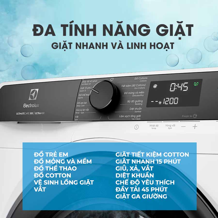 Một tính năng nổi bật khác của máy giặt Electrolux EWF1023P5WC là công nghệ UltraMix. Công nghệ này giúp hòa tan chất giặt tẩy và chất làm mềm trước khi đưa vào lồng giặt, đảm bảo các chất này được phân bổ đồng đều và thẩm thấu sâu vào từng sợi vải. Nhờ đó, quần áo được giặt sạch mà không còn lo ngại về cặn bột giặt dính trên bề mặt vải, hạn chế tình trạng phải giặt lại nhiều lần.
