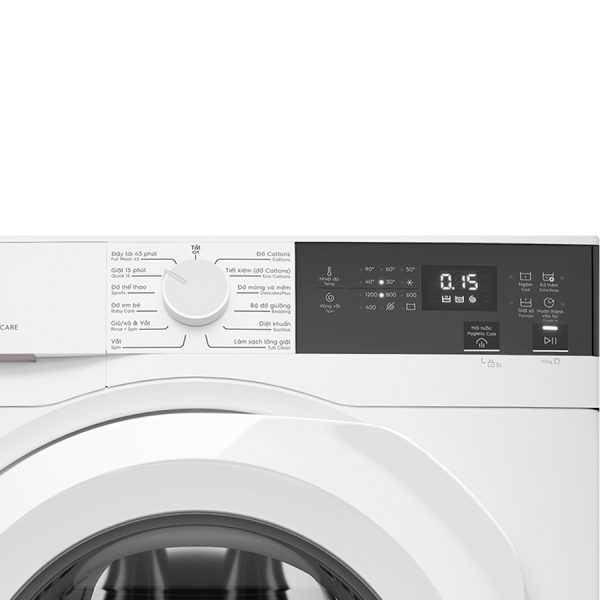 Điểm nổi bật trong phần điều khiển là bảng điều khiển song ngữ Anh – Việt, thân thiện với người dùng Việt Nam. Máy sử dụng núm xoay chọn chương trình trung tâm giúp thao tác nhanh chóng và dễ dàng, đi kèm là các nút cảm ứng hiện đại cho phép tùy chỉnh các thông số như nhiệt độ, tốc độ vắt, thời gian trì hoãn. Màn hình LED sắc nét hiển thị rõ ràng từng thông tin vận hành như thời gian giặt còn lại, chương trình đang chạy, giúp người dùng theo dõi trạng thái hoạt động một cách trực quan. Cách bố trí bảng điều khiển hợp lý hỗ trợ người lần đầu sử dụng có thể dễ dàng làm quen.