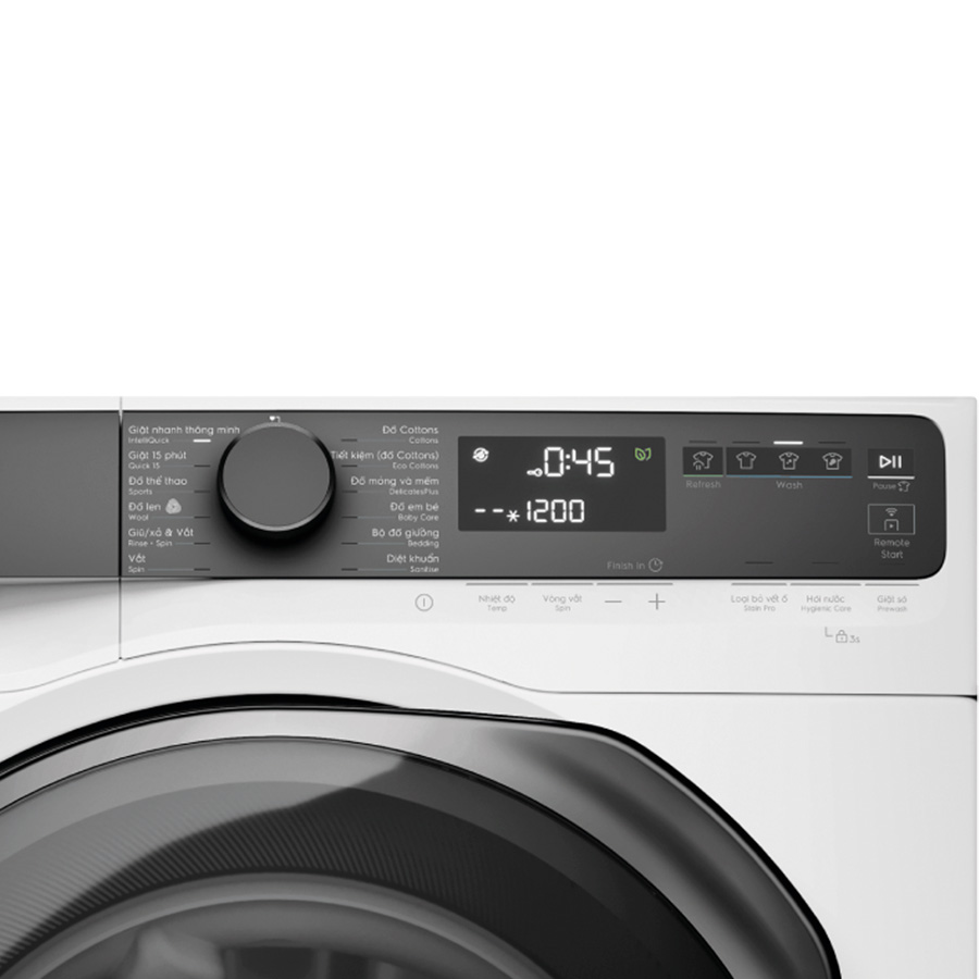 Đặc biệt, bảng điều khiển của máy giặt Electrolux EWF1343R7WC được thiết kế khoa học, thân thiện với người dùng Việt. Máy tích hợp bảng điều khiển song ngữ Anh – Việt, giúp người dùng dễ dàng nhận biết và lựa chọn các chức năng. Trung tâm bảng điều khiển là núm xoay cơ học được bọc viền kim loại, cho phép chọn nhanh các chương trình giặt chỉ với một thao tác nhẹ nhàng. Bên cạnh đó là khu vực cảm ứng hiện đại được thiết kế phẳng và nhạy, giúp điều chỉnh các chức năng bổ sung như nhiệt độ nước, tốc độ vắt, hẹn giờ… một cách dễ dàng. Màn hình LED sắc nét hiển thị đầy đủ thông tin cần thiết trong quá trình vận hành như thời gian còn lại, chế độ đang sử dụng, giúp người dùng chủ động theo dõi và kiểm soát chu trình giặt hiệu quả.