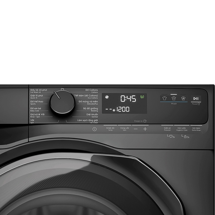 Máy giặt Electrolux EWF9023P5SC thuộc dòng máy giặt lồng ngang – cửa trước, có tông màu xám đen tinh tế kết hợp với bảng điều khiển song ngữ dạng núm xoay dễ dàng sử dụng cùng với đó là màn hình LED hiển thị các thông tin như thời gian giặt, chương trình giặt và các chế độ khác.